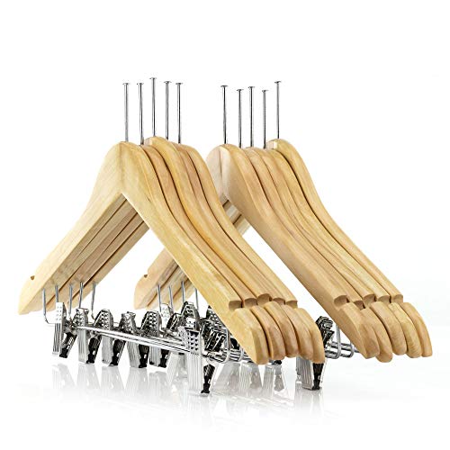 Hangerworld 18 Inch Wooden Hotel Clothes Hangers with Pant/Skirt Clips & Metal Security Hook, Pack of 10