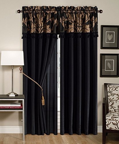 Chezmoi Collection Royale 4-Piece Jacquard Floral Window Curtain/Drape Set Sheer Backing Tassels Valance, Black/Gold