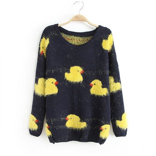O-neck Long-sleeve Sweater Pullover Cute Duck (Navy Blue)