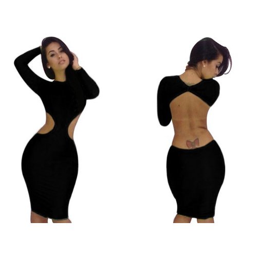 Open Waist Long Sleeve One Shoulder Bandage Bodycon Dress (Black Size M)