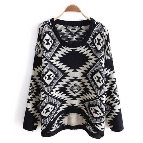 Women Cotton Sweaters Aztec Pattern Long Sleeves Pullovers Black