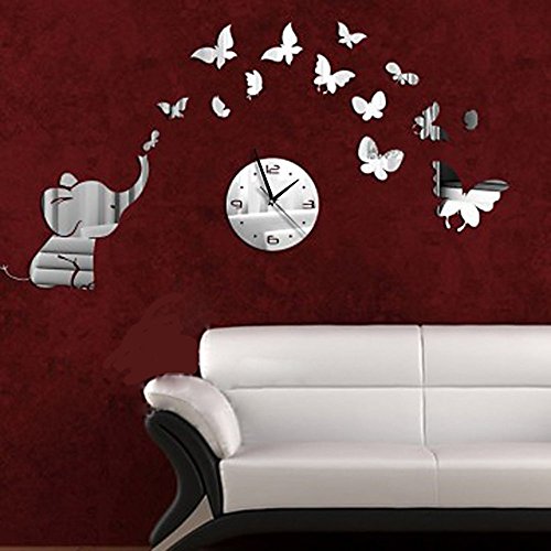 DIY Decorative Modern Mirror Wall Clock Sticker Acrylic Room Silent Large New Bedroom Livingroom Children Office Decore Elephant Butterfly White Round Advance Numbers Self Black Hand Universal 2014