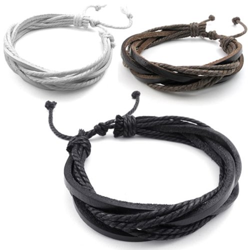 KONOV 3pcs Mens Womens Leather Bracelet, Surfer Wrap Bangle, fit 8-9 inch, Black Brown White
