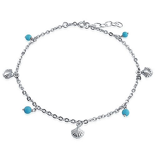 Nautical Multi Charm Seashell Aqua Blue Bed Dangle Anklet Ankle Bracelet For Women Sterling Silver 9-10 Inch Adjustable
