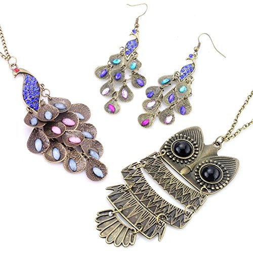 JewelrieShop Vintage Retro Colorful Crystal Owl Pendant Long Chain Necklace with Antiqued Bronze Finish