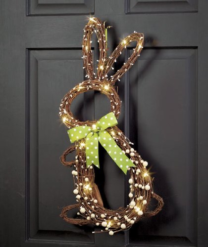 Whimsical Country Grapevine Twigs Decorative 25" LED Lighted Cordless Battery Operated Easter Bunny Springtime Door Hanging Wreath Wall Decor Clear Lights Green Polka Dot Bow Tie Adorable Spring Home Accent Decoration