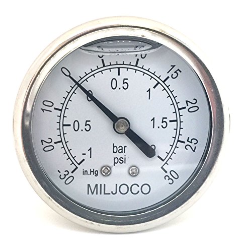 Miljoco PLF2598003 Liquid Filled Pressure Gauge, 2-1/2 Dial Size, 30" Hg-0-30 PSI and Bar