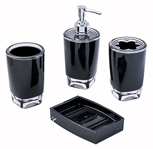 JustNile Essential 4-Piece Bathroom Set in Durable Plastic for Shower and Bathroom, Includes Soap Dish, Toothbrush Holder, Round Tumbler and Dispenser/Pump - Opaque Black