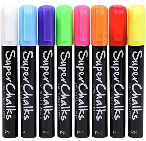 SuperChalks Color Liquid Chalk Marker Pens 8-Pack - 4mm Reversible Tip - ONLY Suitable for Non Porous Surfaces