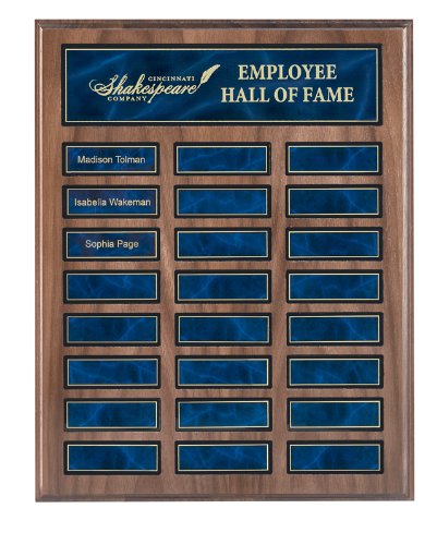 24 Plate Perpetual Plaque 12"x15" CUSTOM ENGRAVED Walnut Finish with Blue Plates