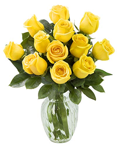 KaBloom Bouquet of 12 Fresh Yellow Roses (Farm-Fresh, Long-Stem) with Vase