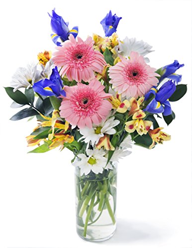 Happy Birthday Wishes Bouquet: 10 Yellow Alstroemeria, 3 Pink Gerbera Daisies, 5 Blue Irises, 3 White Daisy Poms and Lush Greens with Vase - by KaBloom
