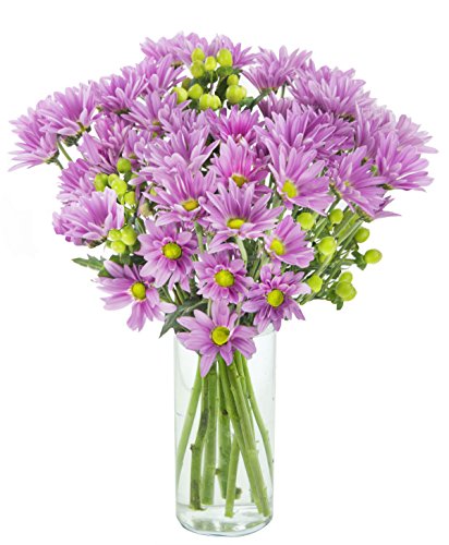 KaBloom Bouquet of Purple Rain: 10 Purple Daisies and Green Hypericum Berries with Vase