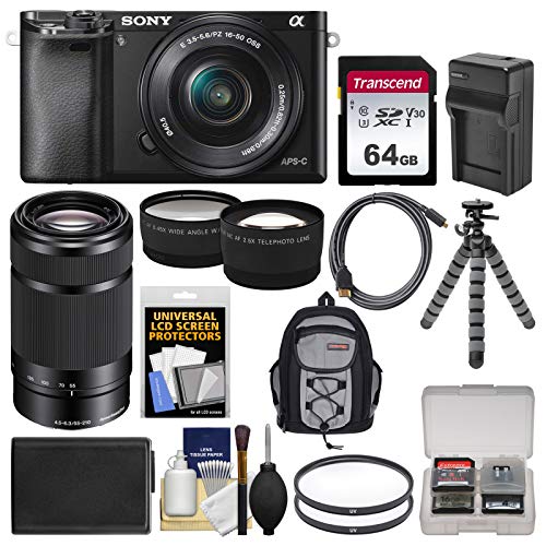 Sony Alpha A6000 Wi-Fi Digital Camera & 16-50mm Lens (Black) with 55-210mm Lens + 64GB Card + Backpack + Battery/Charger + Tripod + Kit