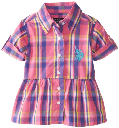 U.S. Polo Assn. Baby Girls' Plaid Shirt with Roll Cuff, Pink Kite, 18 Months