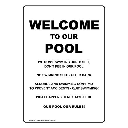 Welcome to Our Pool Sign, White 10x7 in. Aluminum for Recreation by ComplianceSigns