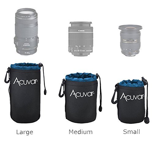 3-Pack ACUVAR Soft Neoprene Lens Pouch for DSLR Lenses (Small, Medium and Large) f/Canon, Nikon, Pentax, Olympus, Sony, Panasonic, Nikkor w/Drawstring, Water Resistant