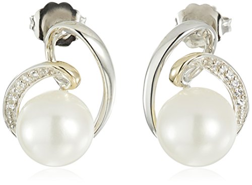 Sterling Silver and 14k Yellow Gold Swirled 9mm Freshwater Cultured Pearl and White Topaz Stud Earrings