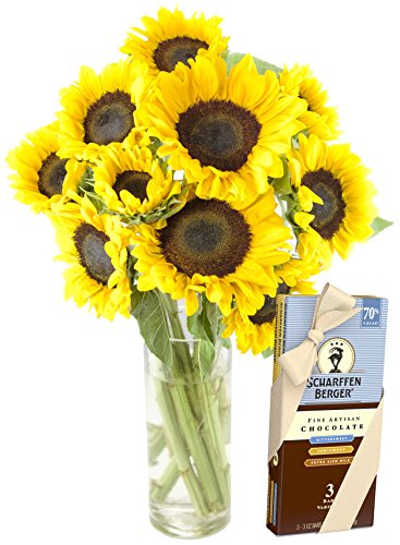 Happy Days Sunflowers and Premium Scharffen Berger Chocolate 3 Bar Bundle - with Vase