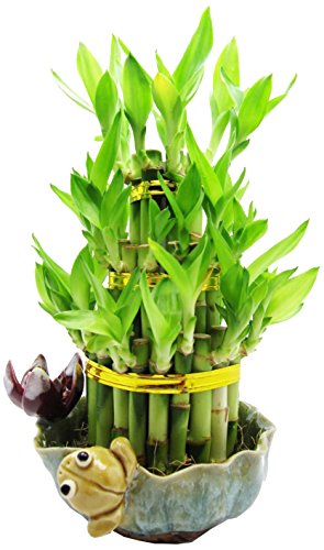 Set of 2 Live Cake Layer Lucky Bamboo Plant Arrangement with Frog and Lotus Handmade Ceramic Pot 40 Stalk