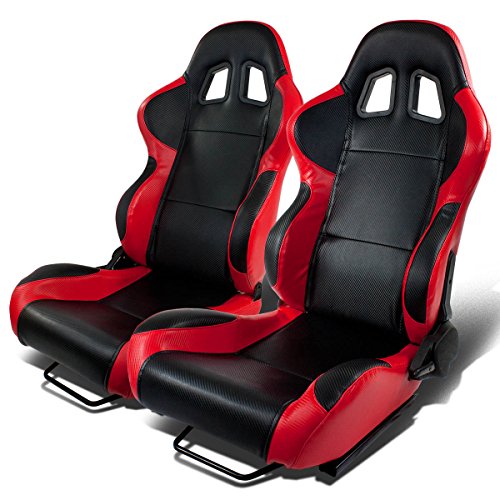 Pair of Full Reclinable Black and Red Carbon Look PVC Leather Type-4 Racing Seat+Adjustable Sliders