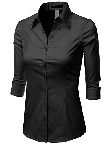 Doublju Solid 3/4 Sleeve Cotton Button Down Collared Shirt (Plus size available), X-Large, Black