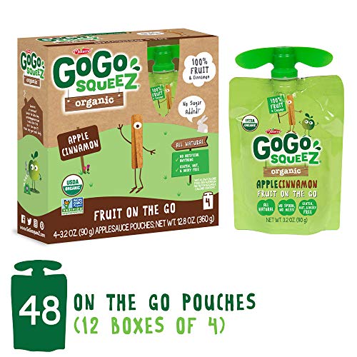GoGo squeeZ Organic Applesauce on the Go, Apple Cinnamon, 3.2 Ounce (48 Pouches), Gluten Free, Vegan Friendly, Healthy Snacks, Unsweetened Applesauce, Recloseable, BPA Free Pouches