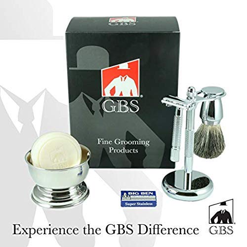 GBS Premium Men's Wet Shaving Kit - Butterfly DE Safety Razor, Badger Bristles Brush, Chrome Shaving Soap Bowl, Shave Soap, Brush and Razor Stand With DE Blades - Classic Vintage Set Makes Great Gift