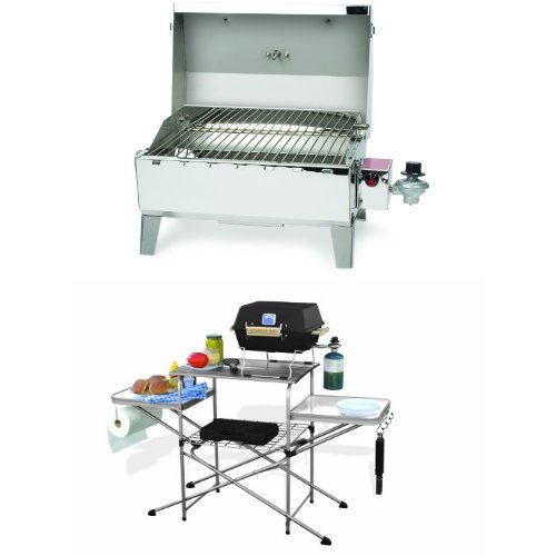 Camco Stainless Steel Portable Propane Gas Grill and Deluxe Grilling Table Bundle