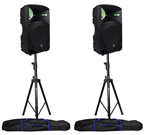 Pair of Mackie THUMP 15 Speakers with Speaker Stands and Travel Bag