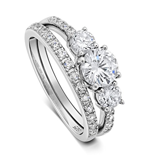 DTLA Sterling Silver"Past Present Future" Three Stone Cubic Zirconia Double Band Engagement Wedding Set