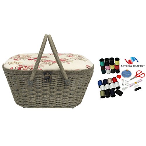 Dritz Sewing Basket Large Picnic (14" L x 10" W x 7" H) Floral in Cream, Taupe & Rose with Artsiga Crafts Sewing Kit