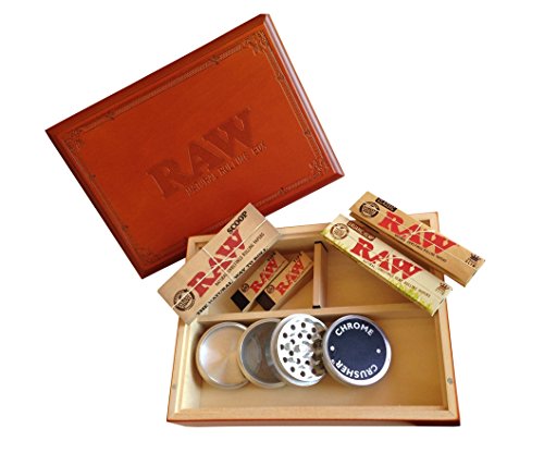 Large Raw ® Special Wood Rolling Box (7 Items Bundle) 4pc Grinder, Organic King Paper, Tips, Scoop Card Tray