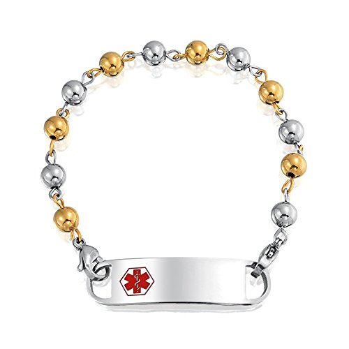 Bling Jewelry Personalized Identification Medical Alert ID Bracelet Bead Ball 2 Tone Gold Plated Stainless Steel Custom Engraved
