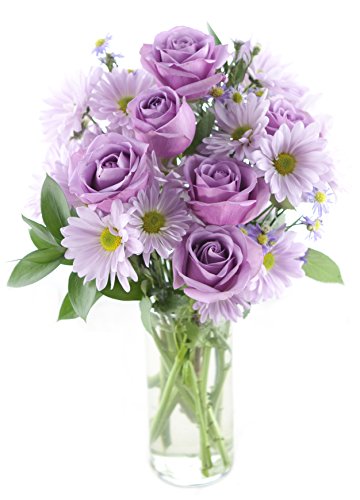 Purple Passion Bouquet of 6 Purple Roses, 6 Purple Daisy Poms, 3 Purple Asters and Lush Greens with Vase