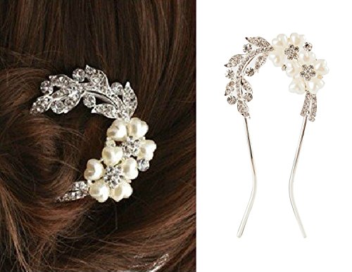 High Quality Stunning Silver Colored Hair Clip / Pin / Barrette With Clear Rhinestones Crystals Studded Leaves Shapes And Heart Shaped White Pearls Creating Flower Forms By VAGA©