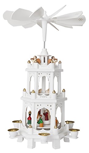 BRUBAKER Christmas Pyramid - 18 Inches - White - Wooden Nativity Play - 3 Tier Carousel with 6 Candle Holders - Designed in Germany