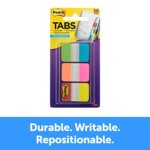 Post-it Tabs, 1 in. Solid, Aqua, Yellow, Pink, Red, Green, Orange, Durable, Writable, Repositionable, Sticks Securely, Removes Cleanly, 6/Color, 36/Dispenser, (686-ALOPRYT)