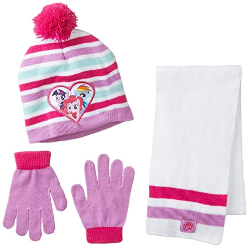 Berkshire Girls' 3 Piece Striped My Little Pony Pom Beanie Glove and Scarf Set, Multi, One Size