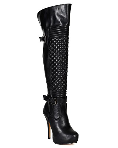 Nature Breeze Women Pointy Toe Platform Quilt Over Knee Stiletto Heel Boot BF60 - Black