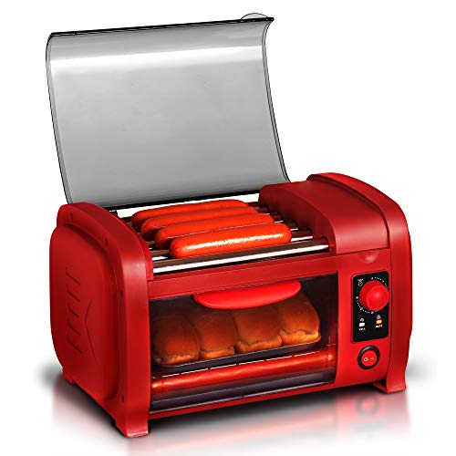 Elite Cuisine EHD-051R Hot Dog Toaster Oven, 30-Min Timer, Stainless Steel Heat Rollers Bake & Crumb Tray, World Series Baseball, 4 Bun Capacity, Red