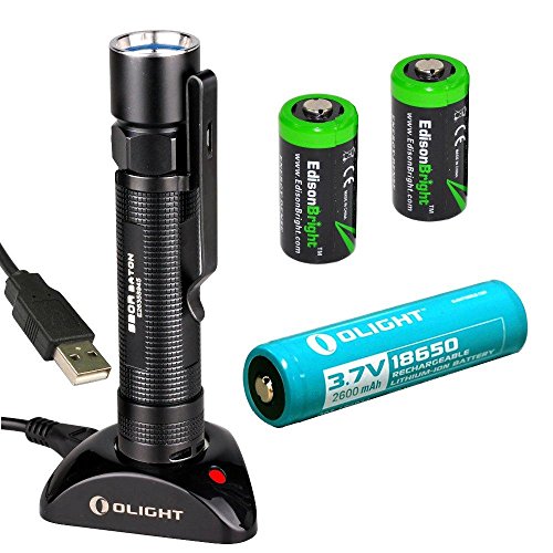 OLIGHT S20R rechargeable XM-L2 550 Lumens LED Flashlight with type 18650 Li-ion battery, charging base with two EdisonBright CR123A Lithium back-up batteries