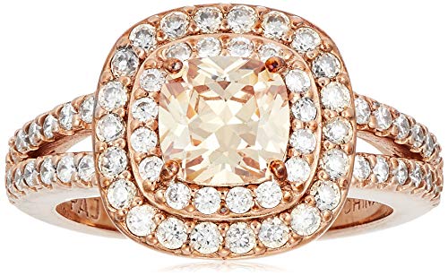 14k Rose Gold Plated Sterling Silver Champagne Cubic Zirconia Cushion Cut 6mm Double Halo Ring, Size 7