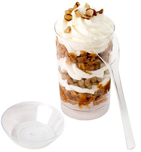 SupaCute Desserts Clear Plastic Tiramisu Tumbler Cups with Caps and Serving Spoons Set of 24 Dessert Glasses, 24 Caps and 24 Tasting Spoons. Recyclable - Washable - Reusable - Freezable - Disposable
