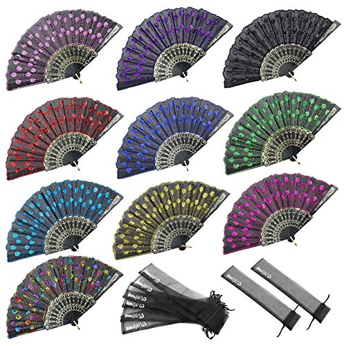 INNOLIFE Elegant Colorful Embroidered Flower Peacock Pattern Sequin Fabric Folding Handheld Hand Fan Hand-crafted (Full Set - 10pcs Mixed Colors) and 8 carrying pouches