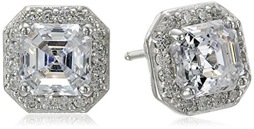 Platinum or Gold-Plated Sterling Silver Swarovski Zirconia Asscher-Cut Halo Earrings (1 cttw)