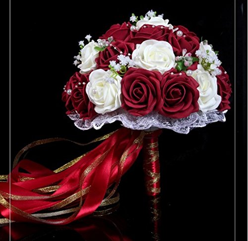 Hestian Wedding Bouquet, Wine Red and Ivory Roses with Pearls Chain, Beautiful Ribbon Bridal Wedding Bouquet Silk Rose Hand Tie