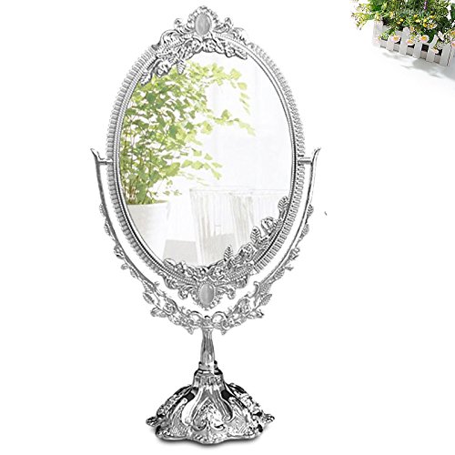 KINGFOM Antique Two Sided Swivel Oval Desktop Vanity Makeup Mirror with Embossed Roses and Mounted Beads for Home, Jewelry or Watches Cosmetics Showcase (Silver, Large)