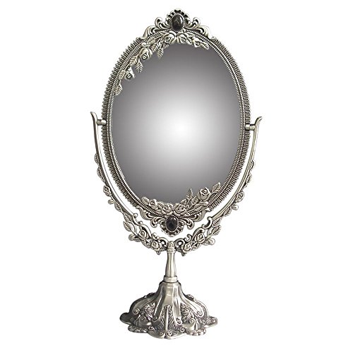 KINGFOM Antique Two Sided Swivel Oval Desktop Vanity Makeup Mirror with Embossed Roses and Mounted Beads for Home, Jewelry or Watches Cosmetics Showcase (Antique Pewter, Large)