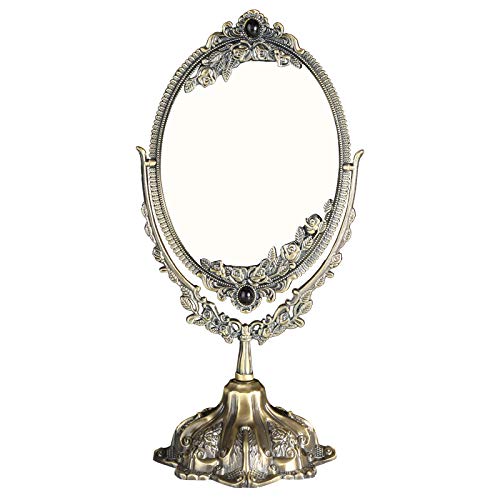 KINGFOM Antique Two Sided Swivel Oval Desktop Vanity Makeup Mirror with Embossed Roses and Mounted Beads for Home, Jewelry or Watches Cosmetics Showcase (Bronze, Standard)